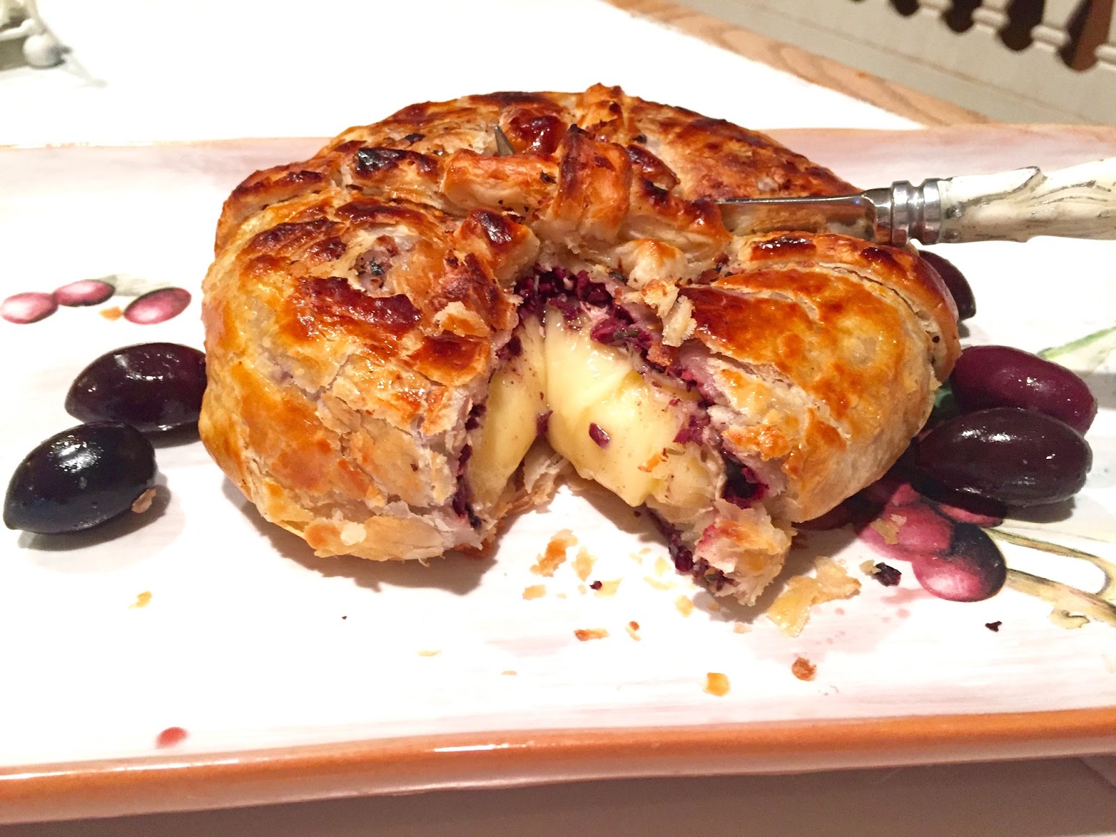 Thaw the pastry sheet at room temperature for 20 minutes. Preheat oven to 400 F. Mix egg and water. Unfold pastry sheet on lightly floured surface. Roll into 12″ square. Cut pastry to make a 10 inch circle. Spread olive tapenade spread to within 1 inch of pastry edge. Place cheese round on top. Brush edges of puff pastry with egg mixture. Fold two opposite sides over cheese. Trim remaining two sides to 2″ from edge of cheese. Fold these two side on the Brie. Press edges to seal. Place seam side down on baking sheet. Decorate top with rolled out reaming pastry to decorate like a holiday package. Brush with egg mixture. Bake 20 minutes or until golden. Let stand 1 hour. Serve with crackers.