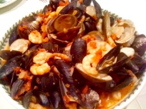 You can add any variety of shellfish and fish depending on what is available at the market. If you like calamari add in place of scallops or white fish. Just use your imagination