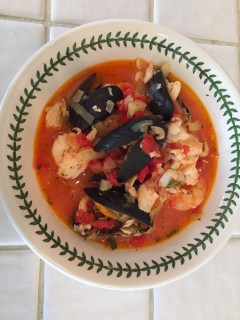 Bouillabaisse, one of my favorite fish stews, can be time consuming and labor intensive if you start from scratch by making the fish stock. Sometimes you just want to have this delicious meal quickly without too much fuss but still with the savory flavors associated with Bouillabaisse.