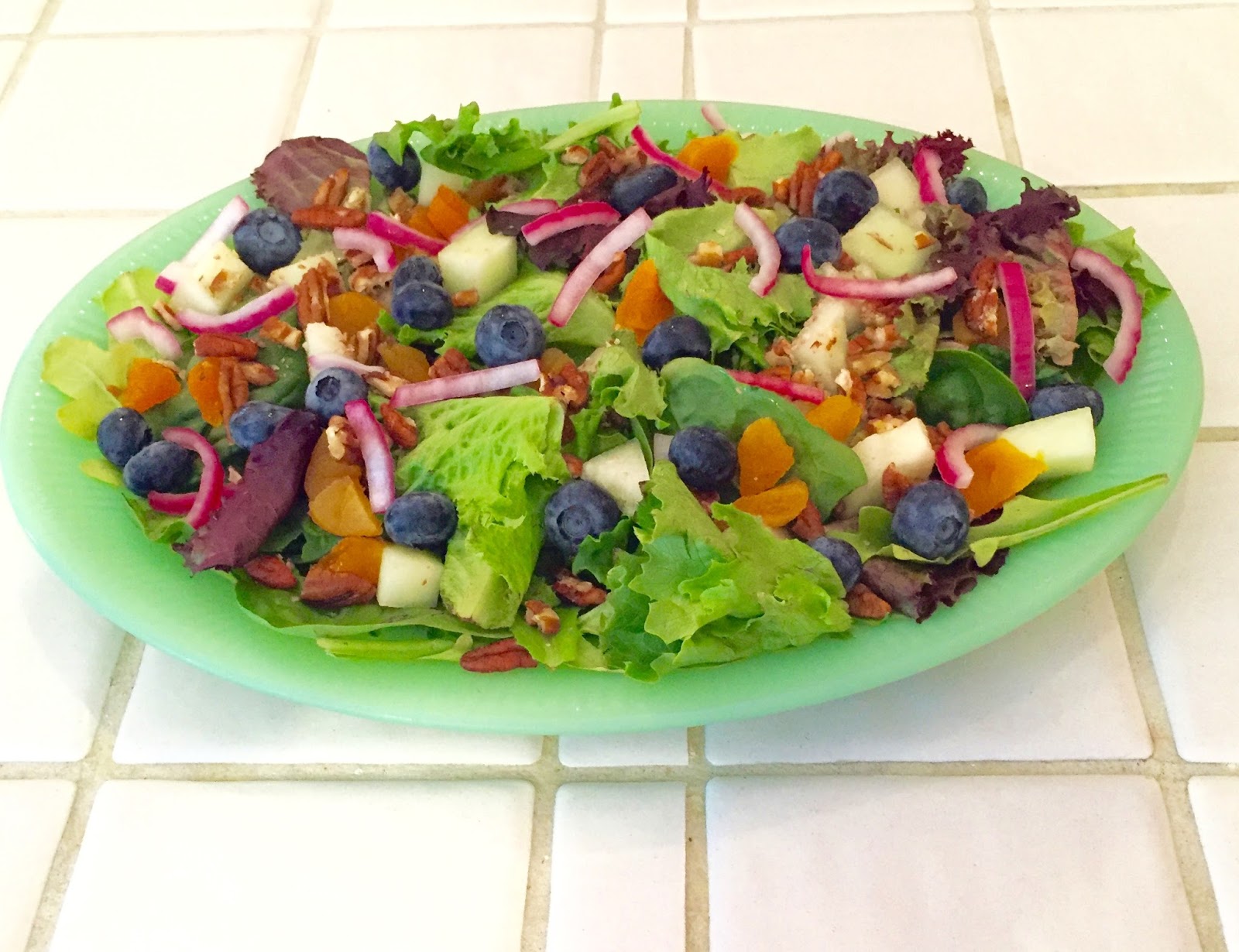 Adding fruit and nuts to salad fresh adds a refreshingly sweet taste to tart greens. I love the combination of spicy greens with the sweetness of melon and blueberries. You can customize this salad using any of your favorite combination of fresh fruit. Sometimes I add dates instead of apricots or pumpkin seeds to replace pecans. Use your imagination to create your own special salad.
