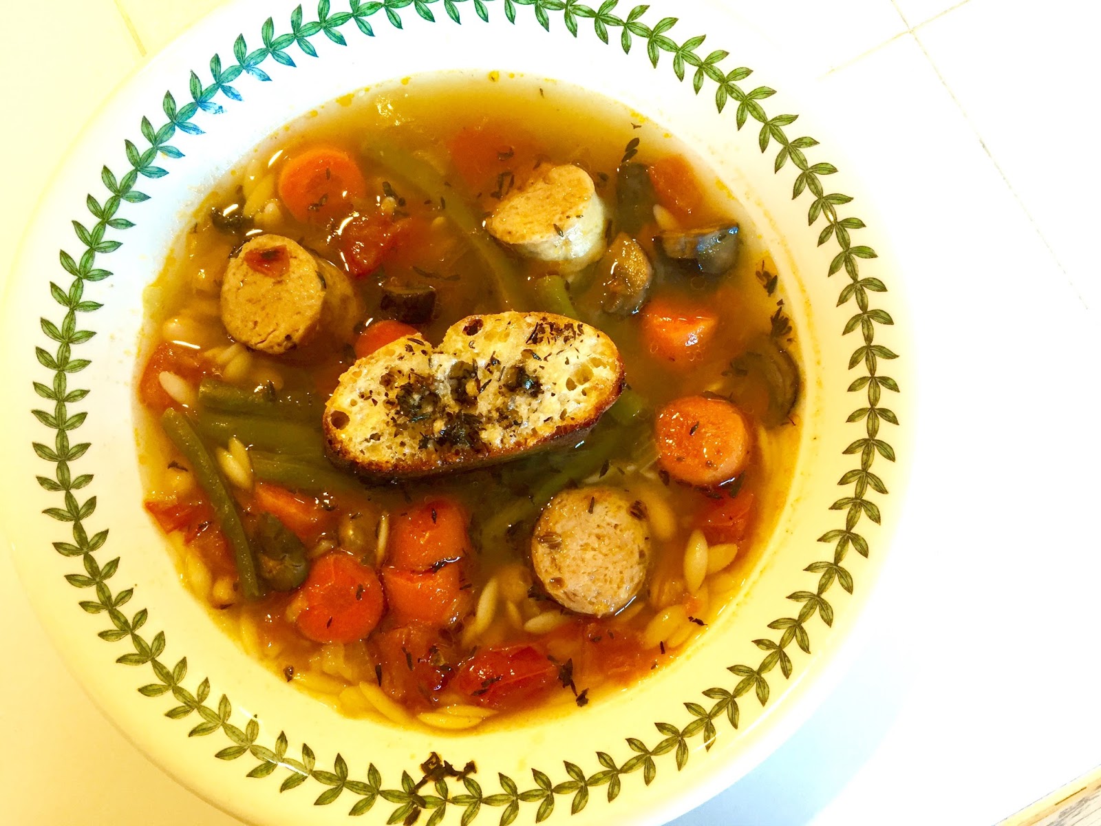 2. Stir in beans, sausage and orzo, and cook, stirring occasionally, 10 to 12 minutes or until orzo is tender. Top each serving with toasted baguette slice.