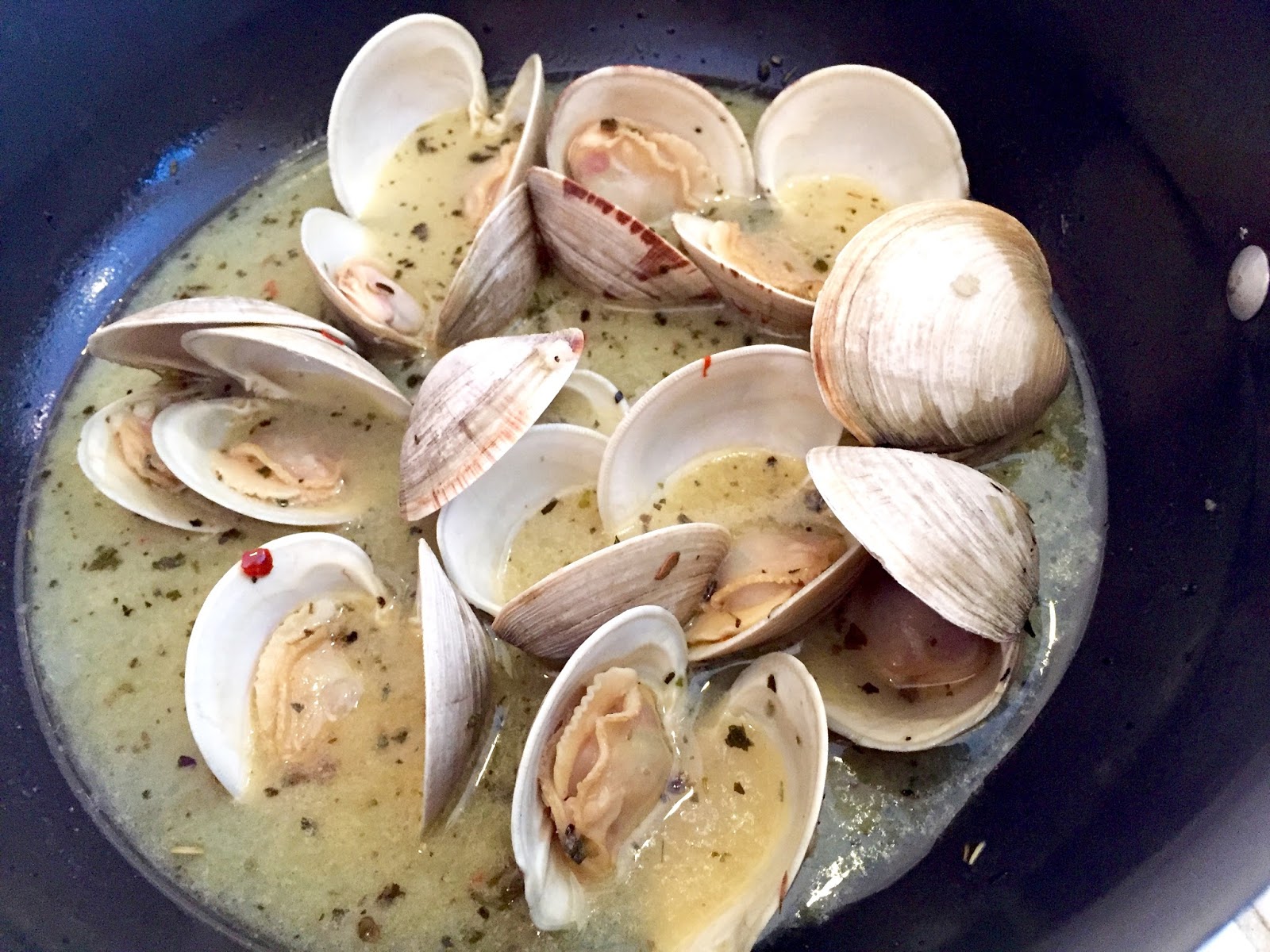 2. In a large pot, heat oil over medium heat. Add garlic; saute for 1 minute, or until tender. Stir in Italian seasons and red pepper flakes. Pour in clam juice and white wine. Bring to boil then simmer for five minutes. Add clams, cover, and steam till clams start to open.