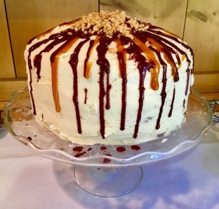 . Cool in the pan for 5 minutes, run a spatula around the edges to loosen and turn out onto a rack to cool completely. Frost and fill with Buttercream Frosting. Drizzle with chocolate glaze, then caramel sauce, topping with Hershey’s Heath Milk Chocolate Toffee Bits.