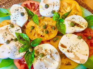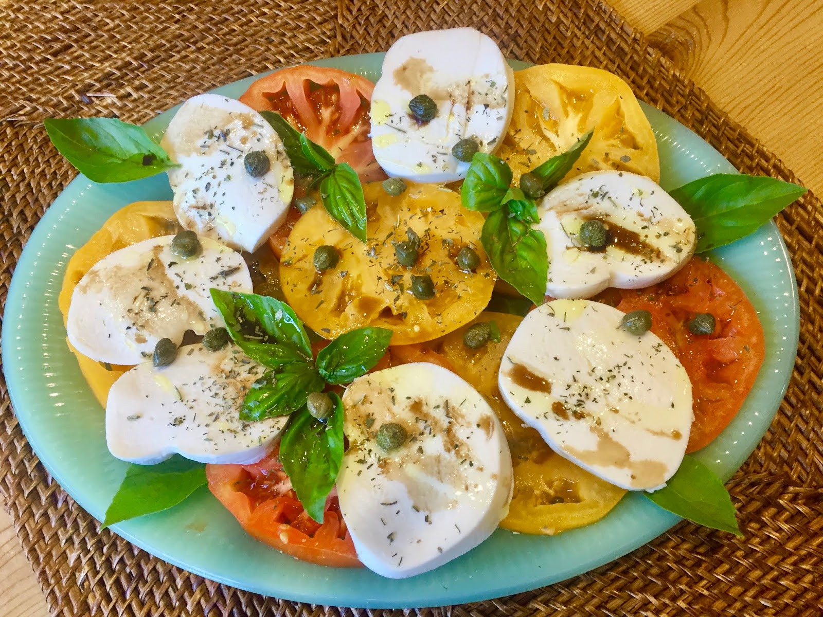 Nothing says summer more than a beautiful Caprese Salad. I love using farm-fresh Heirloom tomatoes in alternating colors. You can use any type of tomatoes as long as they are freshly kissed by the sun not a water down hothouse variety. Here in New England we anxiously wait through our long, cold, snowy winters for the local summer produce to appear in farmers’ markets in all the charming towns indicative to our area. In the town that I live in Wednesday is farmer’s market day or if I am on Martha’s Vineyard you’ll find me Saturday mornings at the West Tisbury Farm market. Being of Italian heritage tomatoes are part of our fabric and growing up I benefited from my grandparents large garden with filled with all different tomatoes varieties; some like plum tomatoes my grandmother canned to use during the winter; others like Bonnie Original, Big Beef, Red Beefsteak heirloom, Better Boy and Cherokee Purple, we sliced for salad and sandwiches. My grandparents used all-natural organic gardening methods passed down from their ancestors. Being raised on the best tomatoes I am very discriminating and ecstatic over the resurgence in fresh farm organic produce locally grown. Mozzarella like tomatoes comes in many varieties, I love cheese so I use different types depending on what is fresh at the market.