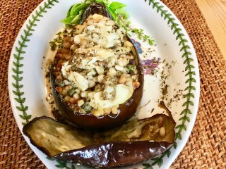 Eggplant a versatile vegetable this is like a chameleon changes assuming the character of the spices and ingredients used by the cook. Eggplant parmesan, beautiful stacked eggplant, tomato, mozzarella towers, baked stuffed eggplant and more I could continue adding to the variety of the eggplant recipes; all equally delicious. I was moved to create this recipe one day when I was at a farmer’s market and saw a beautiful array of eggplant glistening with fresh-picked dew beaconing me to purchase. Once home I started thinking about how to cook the beautiful eggplant and I just decided to leave the eggplant whole hollowing out the center using the meat as stuffing and the shell as a baking dish. As a filler to the ingredients I use La Casa de Grano Fregolo Sarda a traditional Sardinian Pasta that is toasted available at Italian markets such as Eataly or online. I loved the texture and resulting taste all the flavors marrying to create a delicious baked eggplant, a beautiful presentation too.