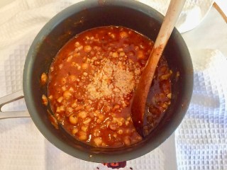 2. Sir in wine, baked beans, garbanzo beans, vegetable broth, and crushed red pepper. Bring to a boil: reduce heat. Simmer, covered for 20 minutes.