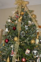 In our family room with a high ceiling, we find the tallest tree on the lot and decorate with ornaments given to us by family and friends. The room and the tree is simmering in deep burgundy and – did I say I love gold- gold!