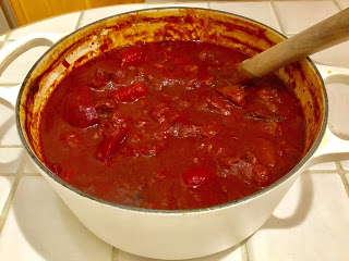 Preheat oven 400F. Dredge meat in flour. Melt butter and oil in a large pot. Cook the beef to rare, remove from pot. And set aside. Cook garlic and onions in the pot until translucent, don’t brown.