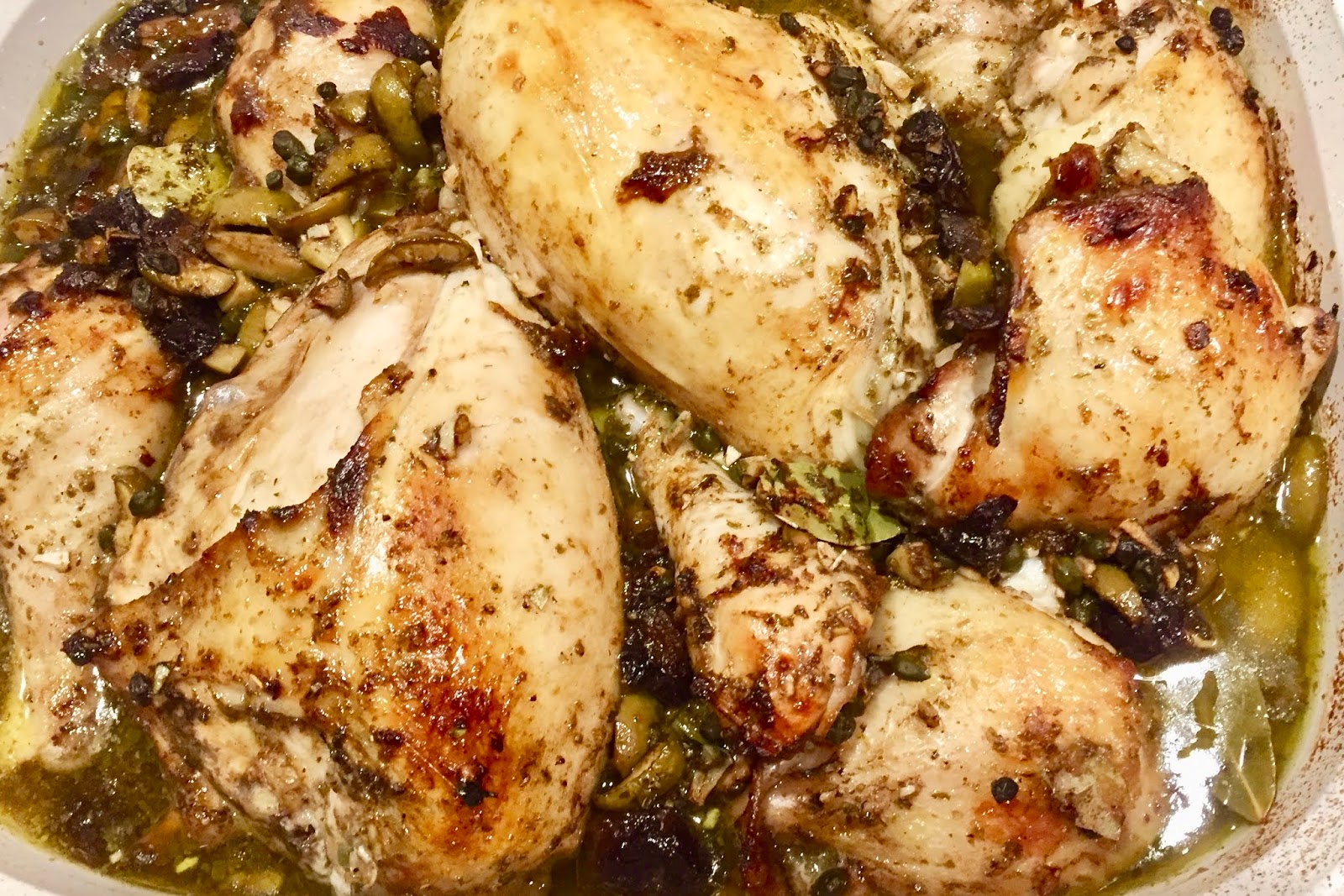 - Combine the olive oil, vinegar, prunes, olives, capers, bay leaves, garlic, oregano, 2 tablespoons salt, and 2 teaspoons pepper in a large bowl. Add the chicken to the marinade. (You can also place the chicken and marinade in a 2-gallon plastic storage bag and squeeze out the air to make sure the chicken is fully covered with the marinade.) Refrigerate overnight, turning occasionally to be sure the marinade is getting into all of the chicken pieces.