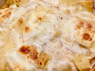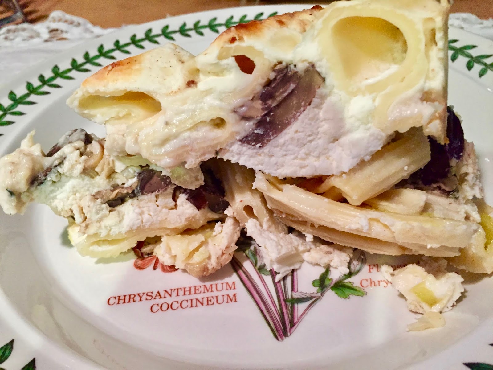 - To assemble the baked rigatoni, spread some of the sauce in the bottom of an 8 x 10 baking dish. I used a Le Creuset dutch oven. Arrange a layer of noodles on top, then 1/2 cheese mixture topped with1/2 of the mushrooms, then sauce. Repeat 1 more time, layering noodles, cheese, mushrooms, and sauce. Top with a final layer of noodles and sauce, remaining mozzarella, sliced and sprinkle with the remaining tablespoon Parmesan. Add a touch of nutmeg on top.