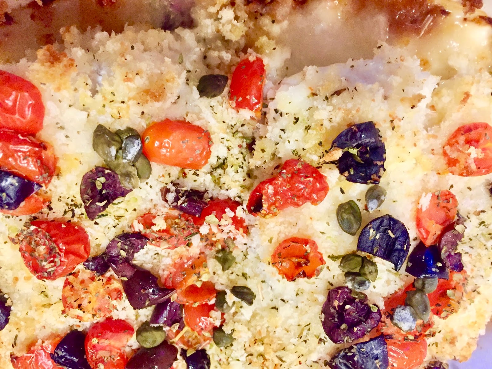 Cover fish with breadcrumb mixture. Top with tomatoes, oil, and capers. Bake for 15 -20 minutes or until the topping starts to brown. Do not overcook. Serve hot or at room temperature.