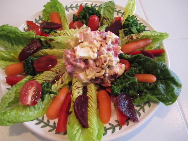 In a medium bowl, mix eggs and mayonnaise.  Add goat cheese and mix until combined.  Add remaining ingredients.  Makes 4 small servings Serve on lettuce with your favorite raw veggies and beets.