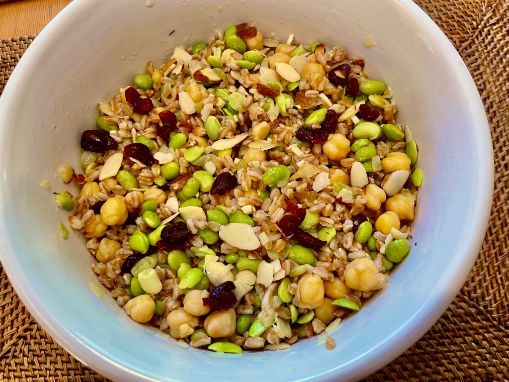 I love bold salads with flavor, texture, and color – perfect for summertime picnics and barbecues. And I also strive to make salads healthy. In my edamame salad, I used farro, an ancient Italian grain that brings a nutty flavor to any dish. Quinoa can be substituted if you prefer. Also, I used honey but if you want a vegan salad, maple syrup can be used.