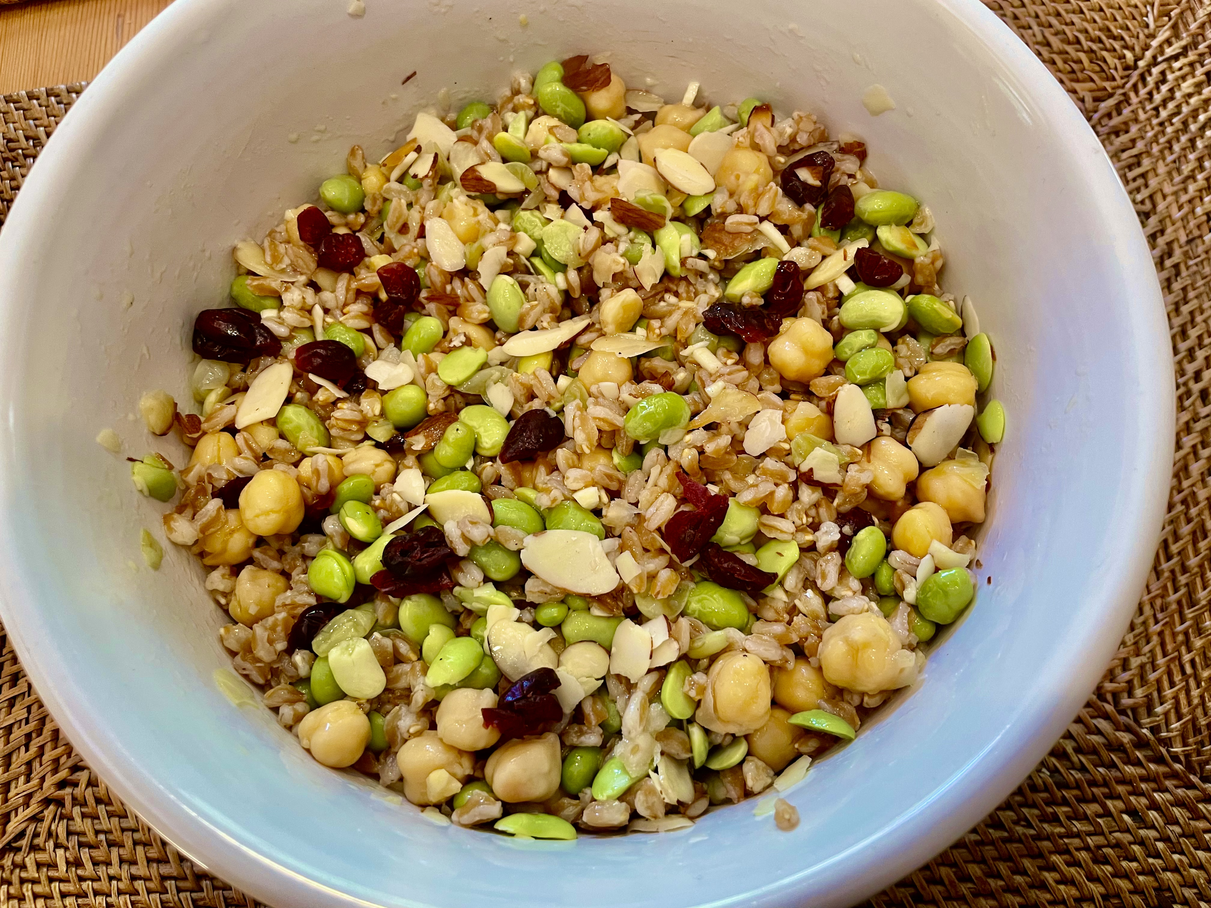 Add edamame, chickpeas, almonds, and cranberries to bowl with farro. Toss to combine. Drizzle dressing over, and stir.