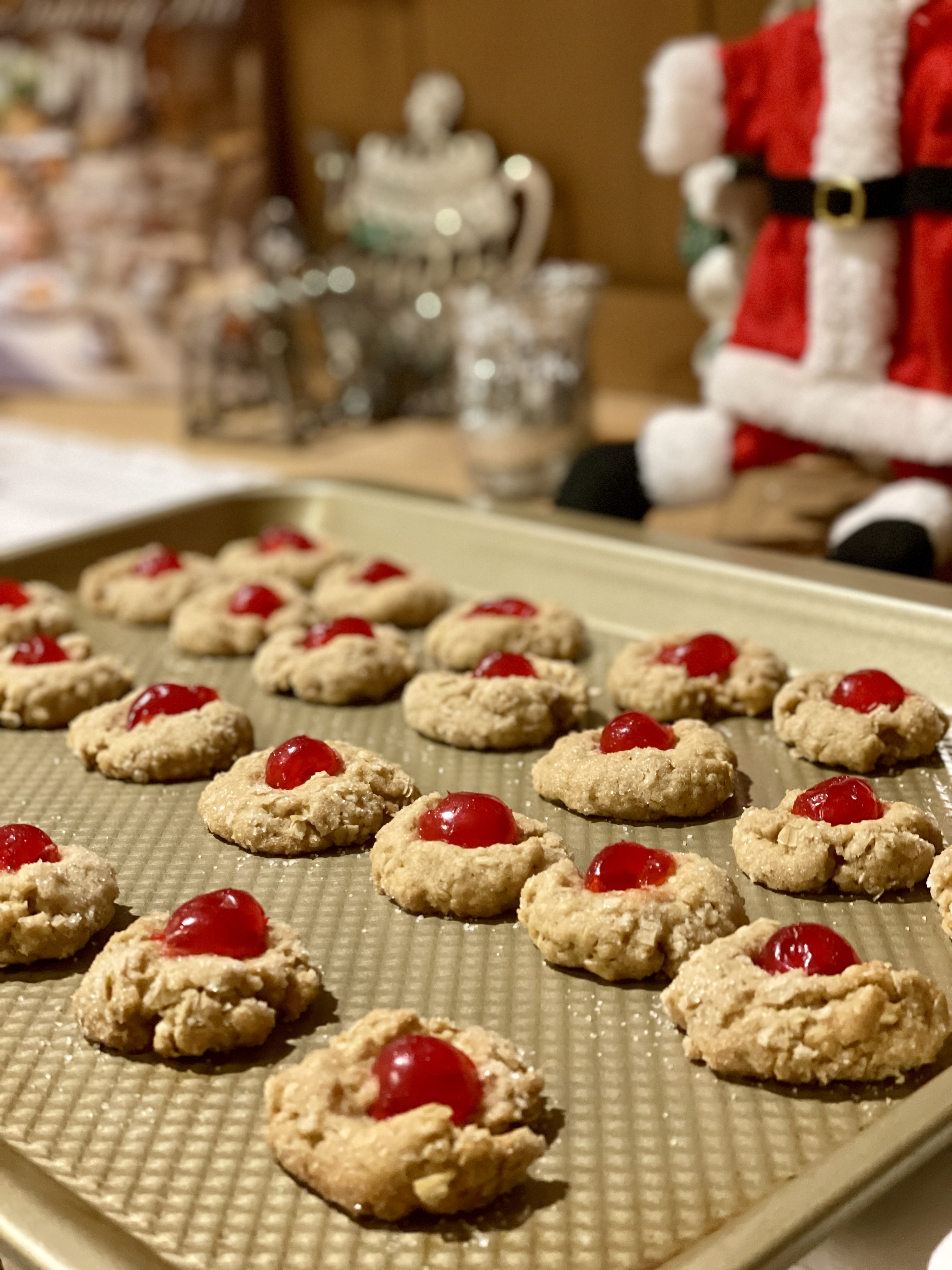 Oatmeal Cherry Rounds are easy to make, simply delicious, and add a festive look to any cookie collection. If you are a cookie virgin, I would suggest these Oatmeal cookies as a tremendous first cookie to bake.  I used red cherries; you can use red and green cherries or pecan in the center; it is also nice.