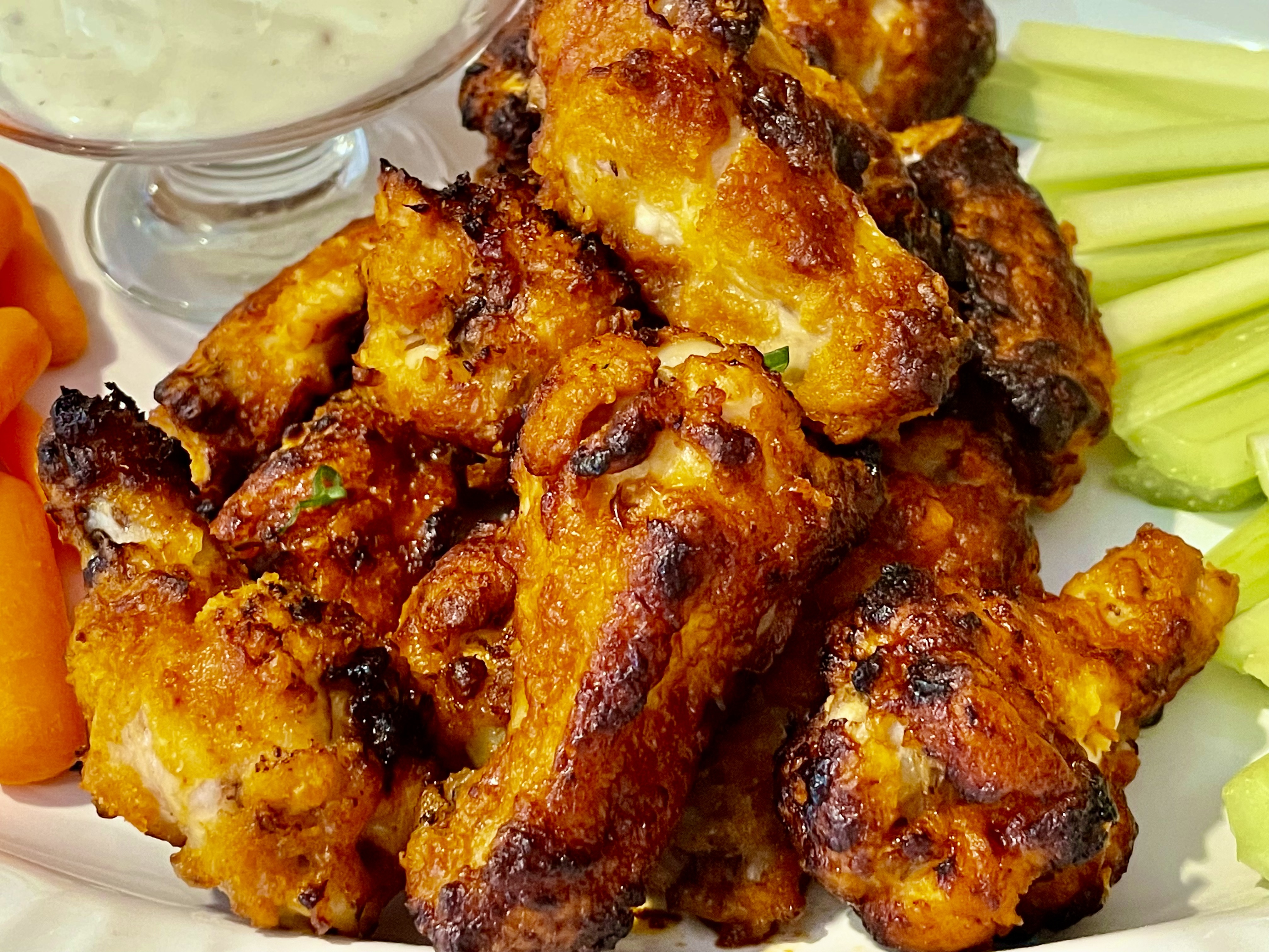 Remove chicken from refrigerator. Dip individual wings into a hot sauce and coat. Place in the air-fryer. Cook at 375° F for 15 minutes. Make chicken in 2-3 patches depending on the size of the air-fryer.