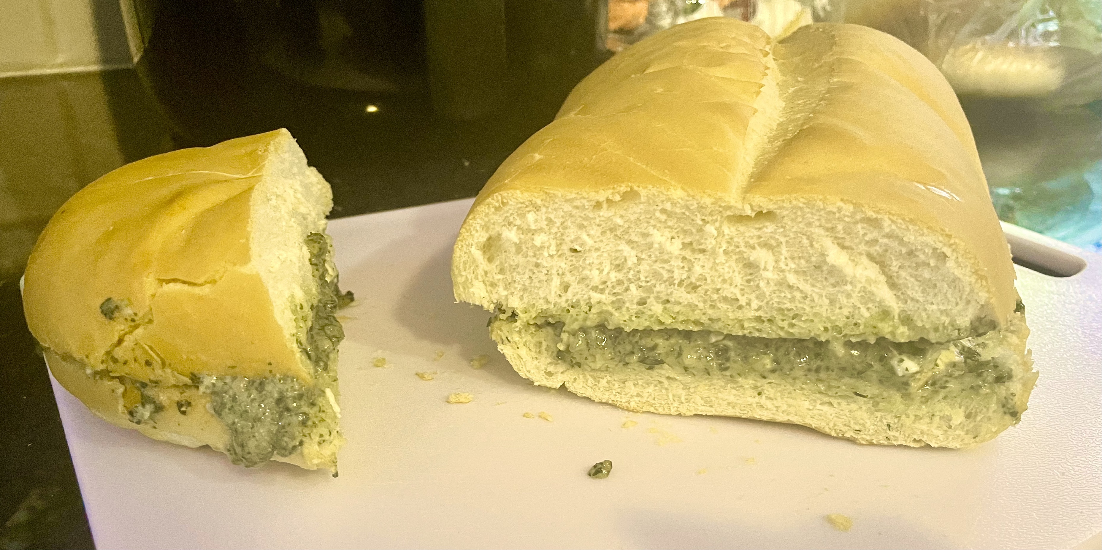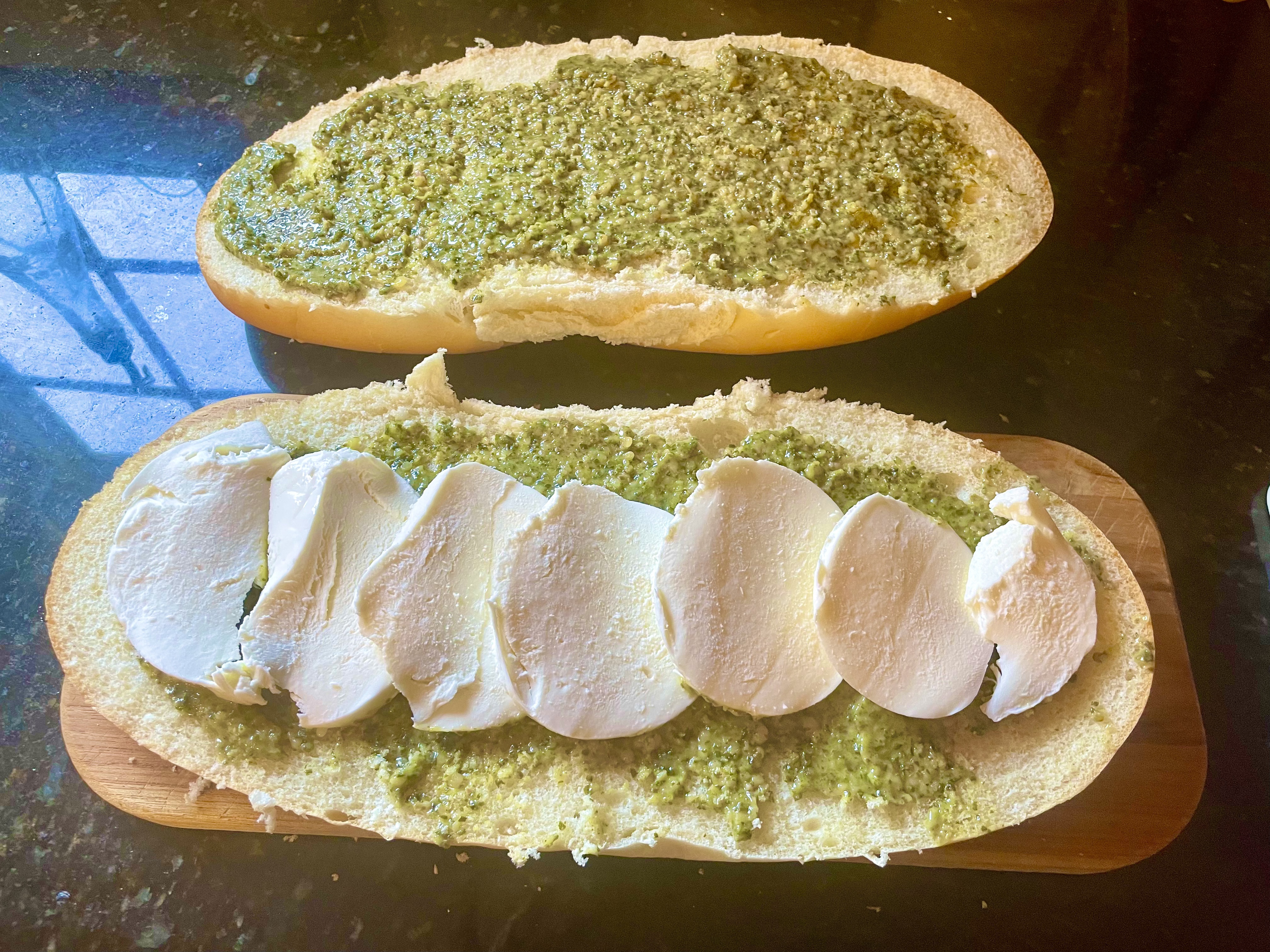 Slice bread in half lengthwise. Spread pesto sauce and top with Mozzarella. Place top on bread. Wrap in aluminum foil and bake for 30 minutes until cheese is melted.