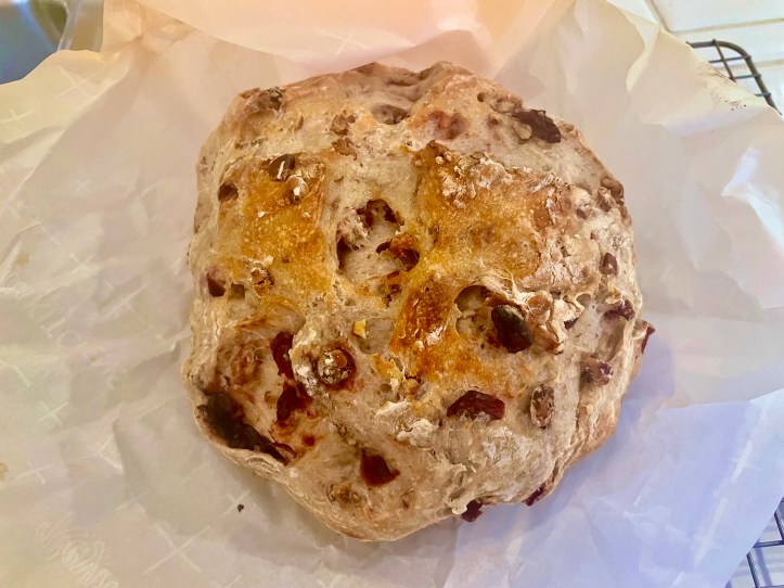 Bread is a welcome addition to any meal, and this festive bread is excellent for Thanksgiving or Christmas. I baked it in a dutch oven or large pot. It turns out crusty with cranberries and pecan baked in the bread. Honey adds a light sweetness that enhances the flavor of the bread.